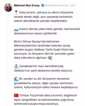 Kültür ve Turizm Bakanı Mehmet Nuri Ersoy, Gelibolu Tarihi Sualtı Parkı’nın dalış turizmi açısından önemini vurgulayarak, bu alanın, Birinci Dünya Savaşı’nda batırılan savaş gemilerini koruduğunu ve tarihsel izlerin keşfine olanak sağladığını belirtti.