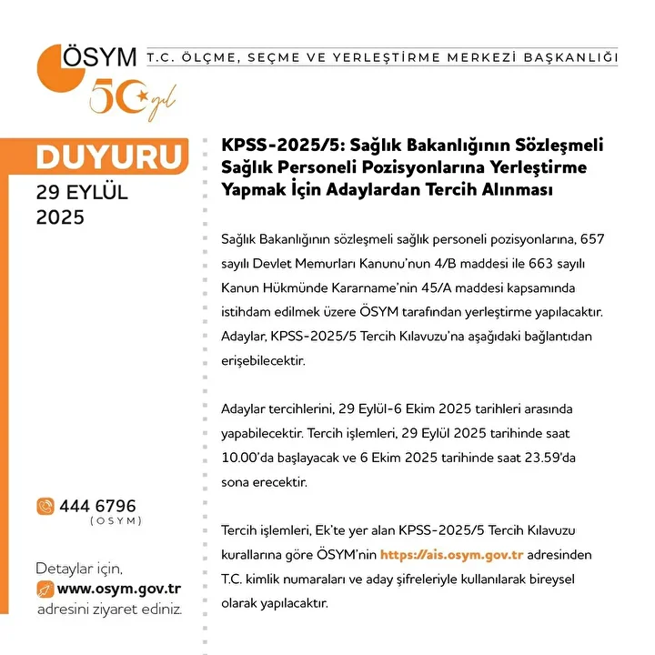 Sağlık Bakanlığı 15 bin 247 sözleşmeli personel alımı tercihleri, 29 Eylül Pazartesi günü başladı ve 6 Ekim 2025 tarihinde sona erecek.